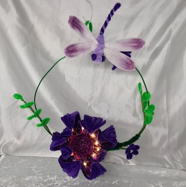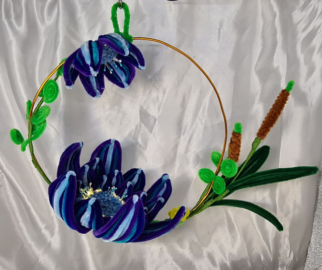 Handgefertigte Seerosen aus buntem Biegedraht mit einer MiniLED im Inneren, sitzen in einem Ring aus Aluminium.